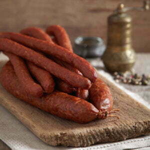 Nos pepperettes sont faites à partir d’une variété de viandes fraîche et de venaison pour nos chasseurs (chevreuil, orignal etc) puis entassés dans des boyaux naturels. Fumés, les pepperettes cuites sont prêtes à manger, chaude ou froide. Nous pouvons assaisonnés ou fumé les pepperettes à vôtre goût